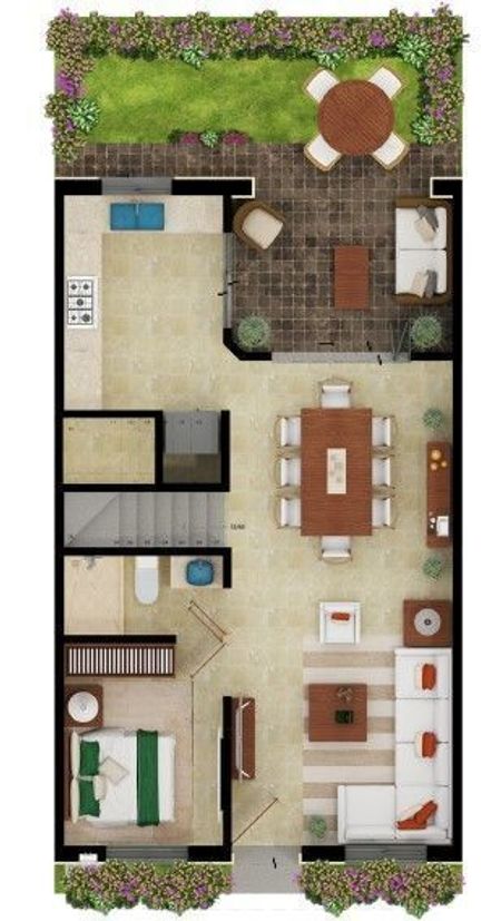 Planta baja: Sala, comedor, cocina equipada, medio baño, cuarto con closet.