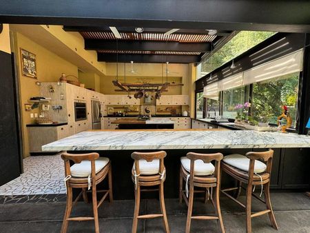 La cocina es linda y enorme con isla grande con superficie de mármol blanco y madera, para darse gusto inventando platillos o simplemente cocinando lo preferido; diríamos que la casa está proyectada en torno de la cocina/lugar familiar preferido-de estar en familia-alrededor de la barra.