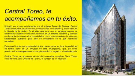 Ubicado en lo que previamente era el antiguo Toreo de Tijuana, Central Toreo forma parte de uno de los proyectos más innovadores y ambiciosos en la historia de la ciudad. Es el sitio ideal para que su empresa crezca, se desarrolle y alcance su máximo potencial en un entorno moderno y cómodo en donde tanto empresarios consolidados como emprendedores tendrán sus necesidades cubiertas para que se concentren en lo que realmente necesitan.