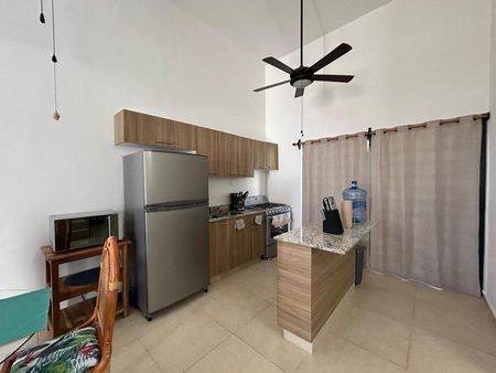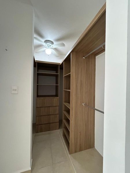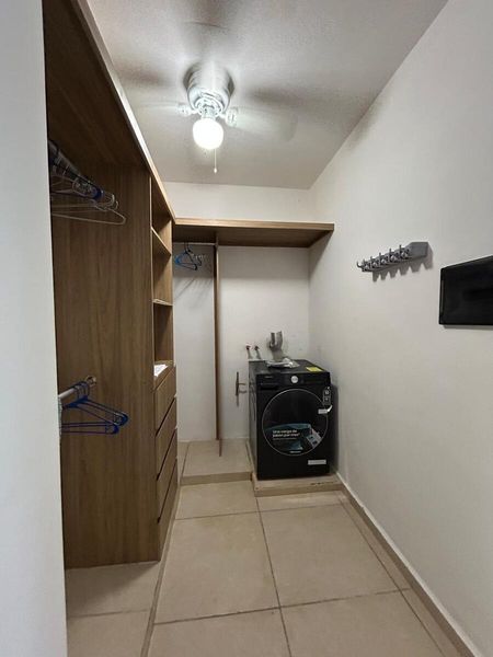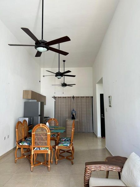 -Sala (doble altura), comedor y cocina corrido con aire acondicionado, 3 ventiladores con luz, cortineros y cortinas. Sala con televisión. Área de cocina con refrigerador, alacenas y gavetas de madera, meseta de granito, estufa con horno, microondas y cafetera