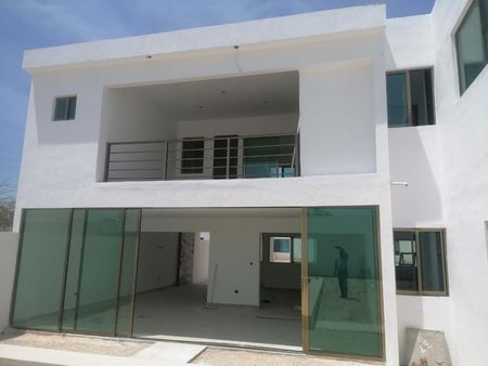 Especificaciones técnicas: pisos de porcelanato, mesetas de granito, acabados interiores de yeso y exteriores de tres pasos, piso estampado en cochera, voltaje 220, pozo profundo con bomba sumergible, cisterna, pasillo lateral, aluminio d e3" color champagne, altura interior a 2.75 m, bardas de 2.50 m tinaco, no incluye carpinteria.