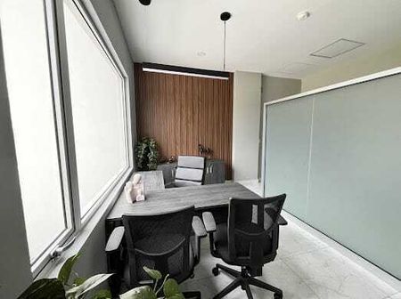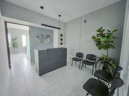 Muros divisorios entre consultorios de tablaroca con aislamiento acústico; división de tablaroca entre área de recepción y de consulta; puertas abatibles; número y placa de cada consultorio, medio baño, luminarias, piso cerámico de 60 x 60; se entregan en obra gris con salidas para aire acondicionado, teléfono, internet