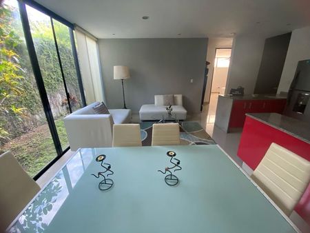 Sala comedor y cocina, abiertos con salida a un jardín pequeño.