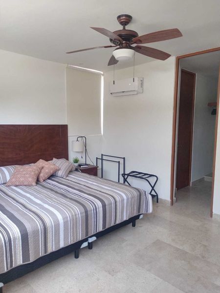 Recamara secundaria con baño con doble puerta, que sirve de baño de visitas, cama Queen size, aire acondicionado y ventilador