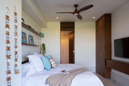 Dos recámaras, la principal con balcón y walk-in closet, la secundaría con balcón, closet de pared de muy buen tamaño y baño completo comparte con visitas.