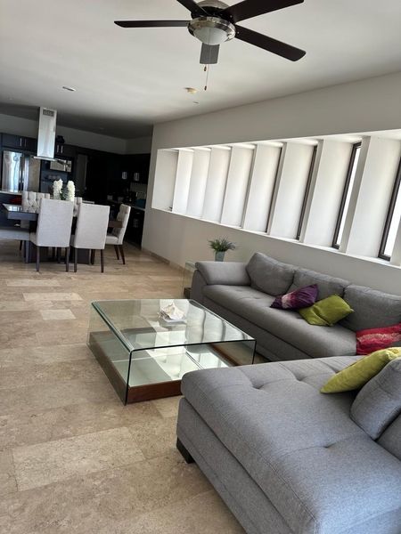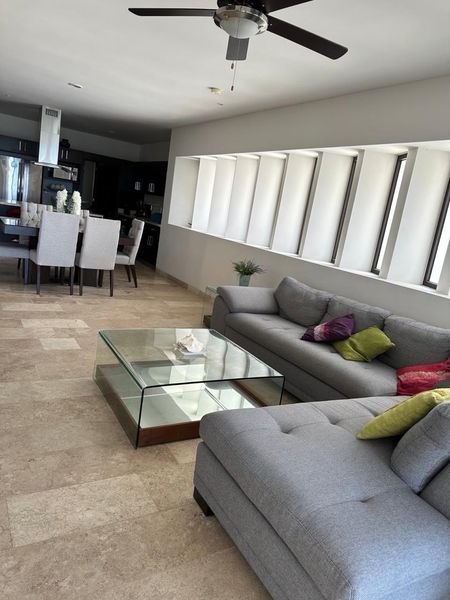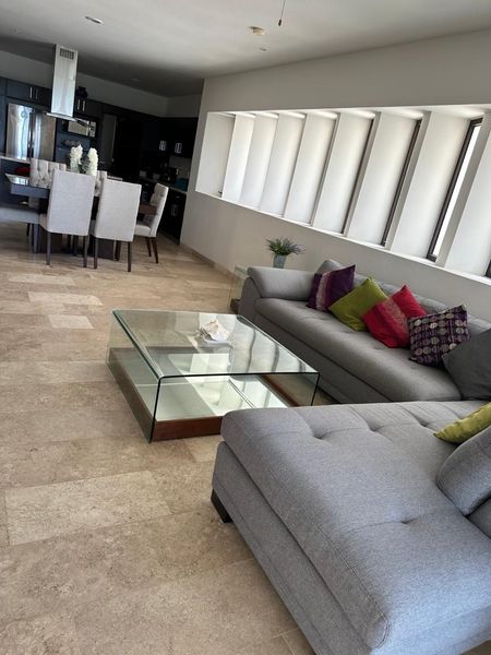 - Área de cocina conforme sala y comedor corridos vista a la terraza.