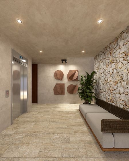 Los departamentos cuentan con acabados de lujo, incluyendo pisos de mármol travertino, mesetas de granito en la cocina y mármol en los baños, carpintería de alta calidad y preparación para aire acondicionado.