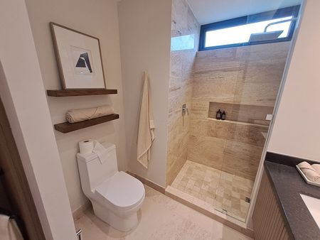 • Lambrines en áreas húmedas con recubrimiento en mármol travertino. Para el piso en la ducha se utilizará mármol en un formato antiderrapante.
