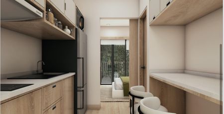 Son departamentos tipo suite de 1 recámara de 35.86m2, 1 baño y en este caso con una terraza de 19.00m2. haciendo un total de 54.90m2. con finos acabados de piso laminado veteado de 8mm. porcelanato, barra de granito natual en cocina y vidrio templado en baños.
