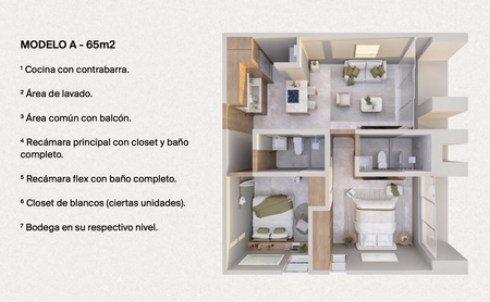 El modelo A presentado aquí cuenta con una amplia sala de estar, cocina con barra de desayuno, área de lavado, 2 espaciosas habitaciones con baño propio, al igual que su propio balcón privado.