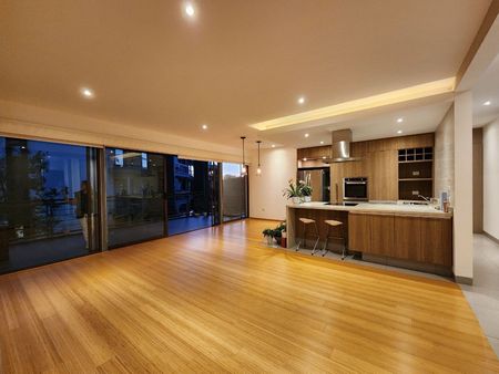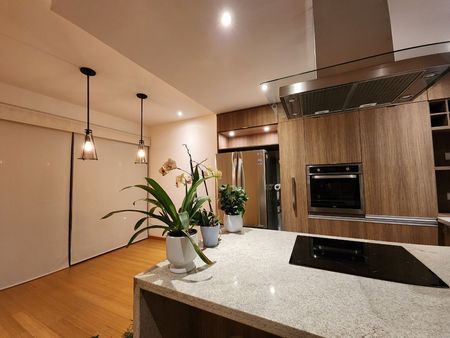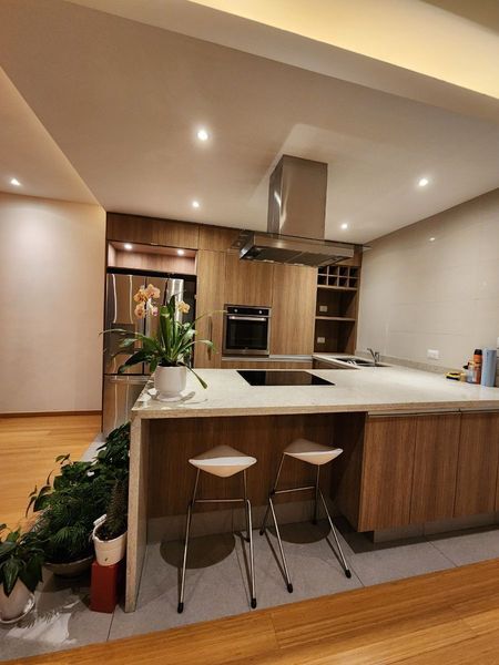 Cocina abierta en granito con parrilla eléctrica, horno eléctrico, doble tarja y lavavajillas.
