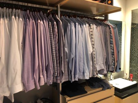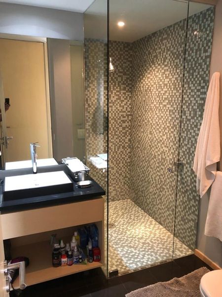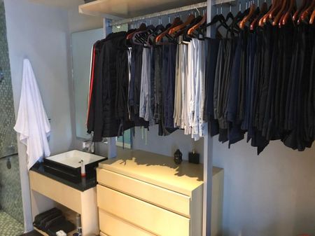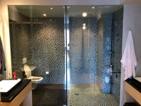 Recámara con vestidor integrado, con cancel de vidrio templado y doble lavabo