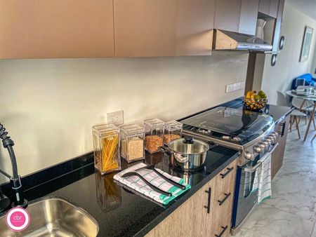 Cocina integral abierta con cubierta de granito y alacena, área de lavado, 2 recámaras amplias, 2 baños completos. la recámara principal con clóset, baño y cabe cama King size, 2 burós y cómoda. La 2da recámara con clóset y comparte baño con el área de visitas.