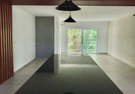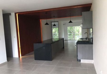 El departamento cuenta con cuarto de lavado, cocina, sala comedor, 2 recámaras y 2 baños, la recámara principal cuenta con baño completo, muro de cabecera con textura, vestidor, acabados en madera, granito y canceles de acero inoxidable y vidrio templado. La recámara dos cuenta con closet de madera y baño completo.