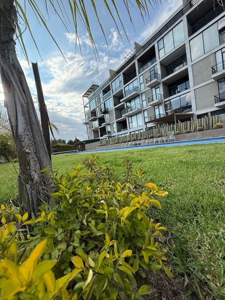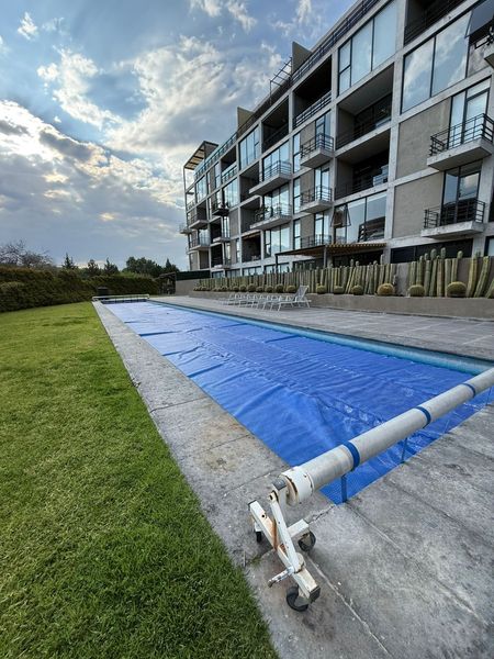 Amenidades con alberca, camastros, salón de eventos, gimnasio, coworking, juegos infantiles, acceso controlado con caseta y guardia 24/7