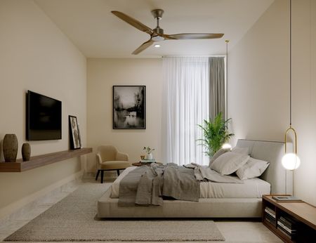 Recámara principal con closet vestidor y baño