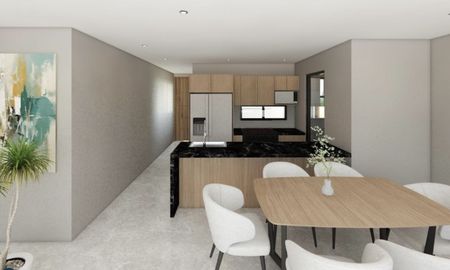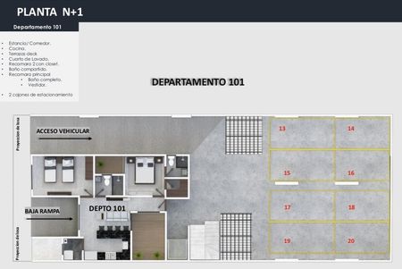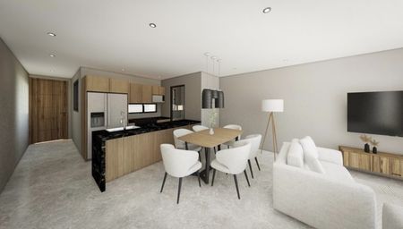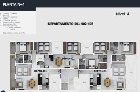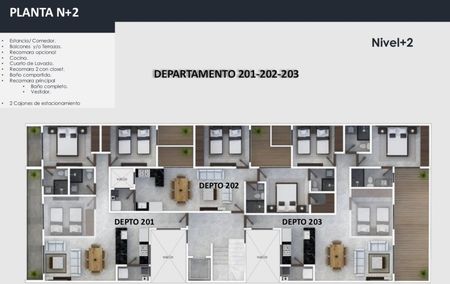 2 a 3 recámaras, 2 baños completos, cocina integral, sala, comedor, área de lavado, 1 bodega y 2 lugares de estacionamiento.