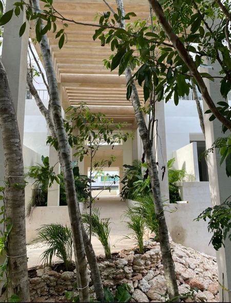 Con acabados que armonizan con la región y una piscina que asemeja un cenote rodeado de vegetación exhuberante.