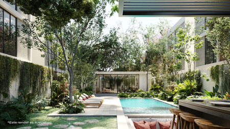 verdes de árboles y plantas de Yucatán, terrazas, piscina, asoleadero, área de grill y un espacio cerrado para eventos y baños.