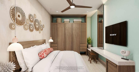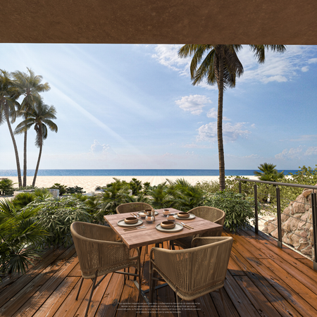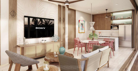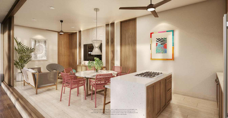 Todos cuentan con sala, barra desayunadora, vienen amueblados y cuentan con terraza con vista a la playa o laguna