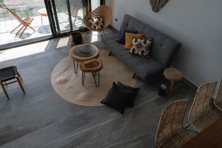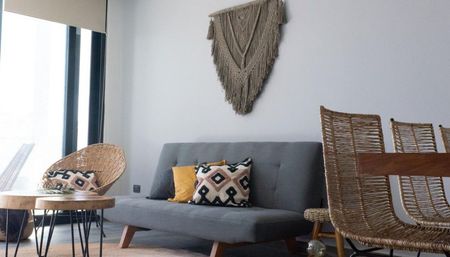 - Sala de estar: Sofá cama, taburete, mesa central, Smart TV Full HD 42 ", set de decoración, ventilador.