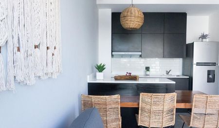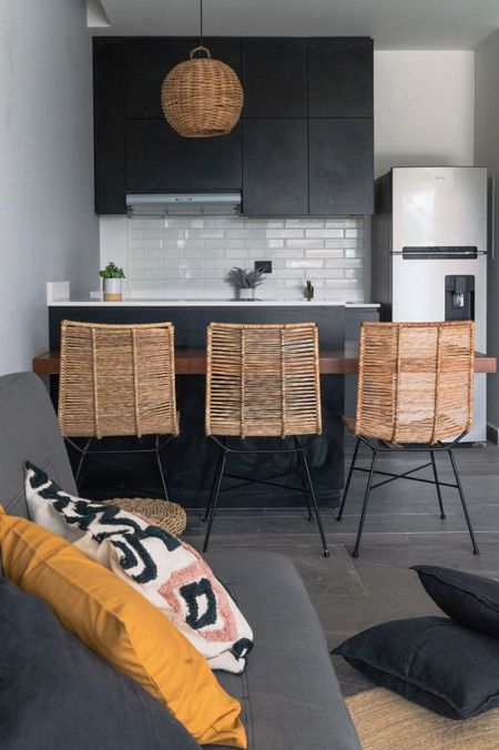 - Cocina: Estufa eléctrica, extractor de humo, mesa de desayuno, sillas, refrigerador, microondas, cafetera y tostadora.
