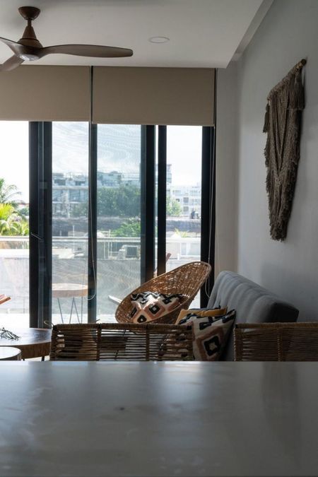 - Recámaras: Somier y colchón Queen Size, 2 mesas laterales, set de decoración, ventilador, silla de ratán (dormitorio principal), ropa de cama.