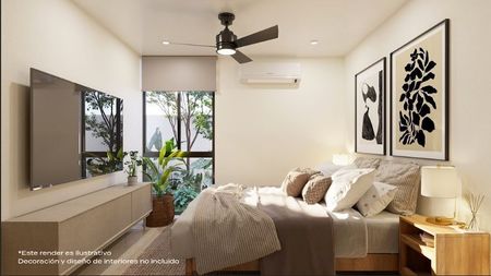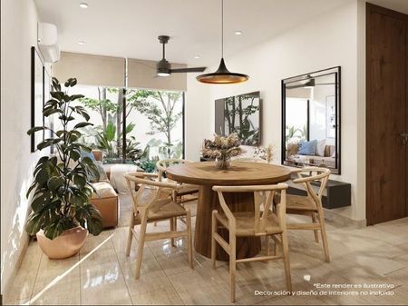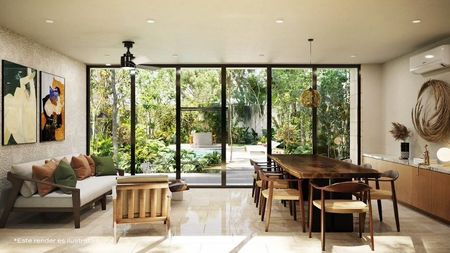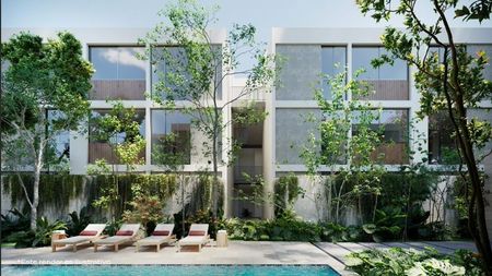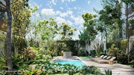 vegetación natural. Los edificios se unen mediante un área central de amenidades. La propuesta incluye espacios verdes de árboles y plantas de Yucatán, terrazas, piscina, asoleadero, área degrill y un espacio cerrado para eventos y baños.