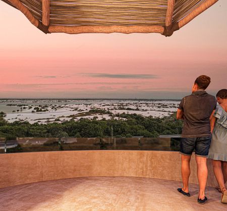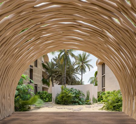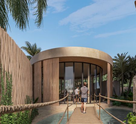 Recepción tipo resort, túnel de bambú y mirador a 15 m de altura