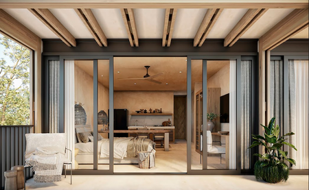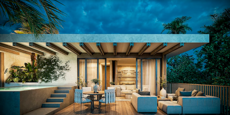 Cuenta con espectaculares áreas exteriores tales como una alberca tipo cenote, espacios para meditar o divertirse.