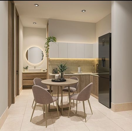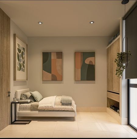 1 Refrigerador + Comedor Circular + 4 Sillas para Comedor + Parrilla Eléctrica + 3 TV’S 40” + 1 Base TV fija + 2 Bases TV móvil + 1 Box Individual + 1 Colchón Individual + 1 Cabecera Individual + 1 Silla para Recámara + 1 Sofá Cama + Microondas + 2 Enrollables Black Out + Carpintería + 2 Mini Splits