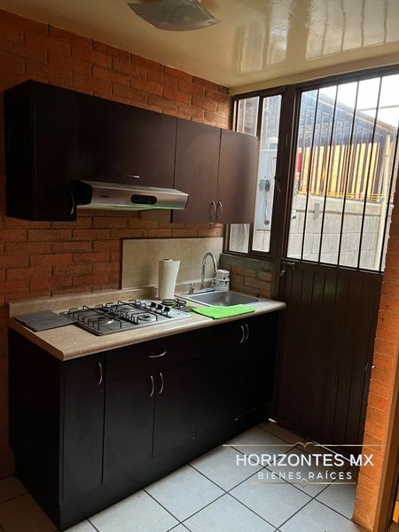Casa en renta en el fraccionamiento Manantial, modelo de cuarzo, por $7,500 al mes. Contrato mínimo de un año. La casa cuenta con tres habitaciones, cocina equipada, una habitación en la planta baja con baño completo, patio de servicio y cochera. En la planta alta hay dos habitaciones y un baño completo. No se permiten mascotas.