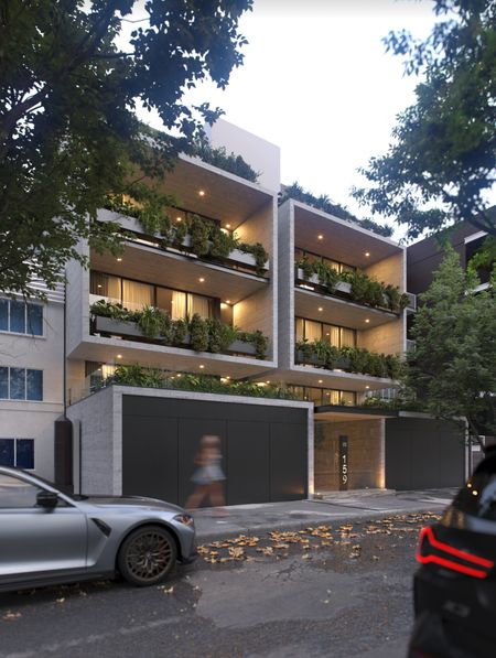 El edificio cuenta con 4 niveles en total son 2 departamentos por piso ( 8 Departamentos en total ) El edificio se encuentra en construcción SE ENTREGA EN MARZO 2025 y el proyecto está en su totalidad vendido únicamente 3 departamentos disponibles, cuenta con Guardia de vigilancia 24/7 y cámaras de vigilancia circuito cerrado, tiene elevador y cuenta con área de estacionamiento para los residentes.