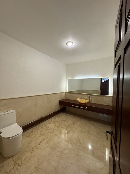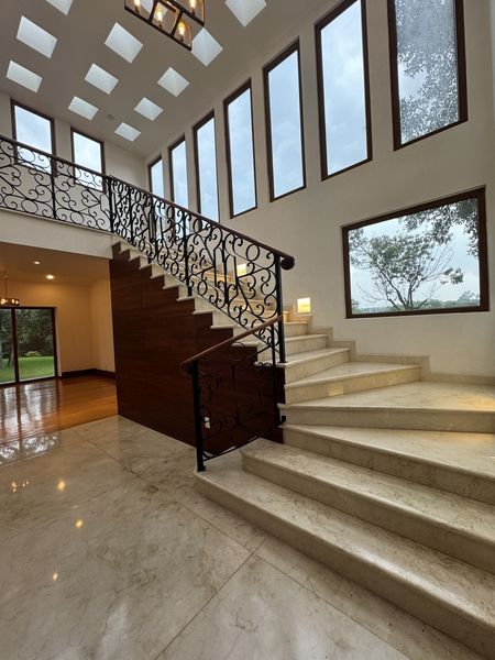 Gran hall de acceso principal a doble altura, señorial escalera con pasamanos de forja, área de bar, Pisos en placa de mármol crema marfil español. Medio baño de visitas con plancha de ónix.