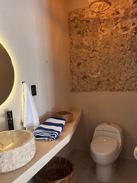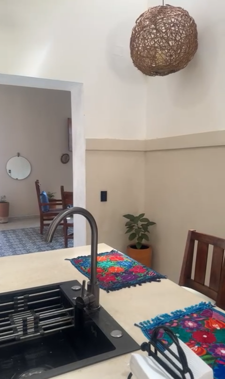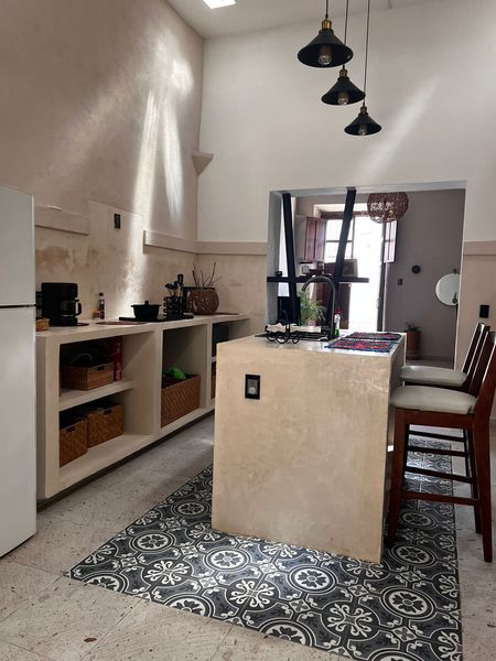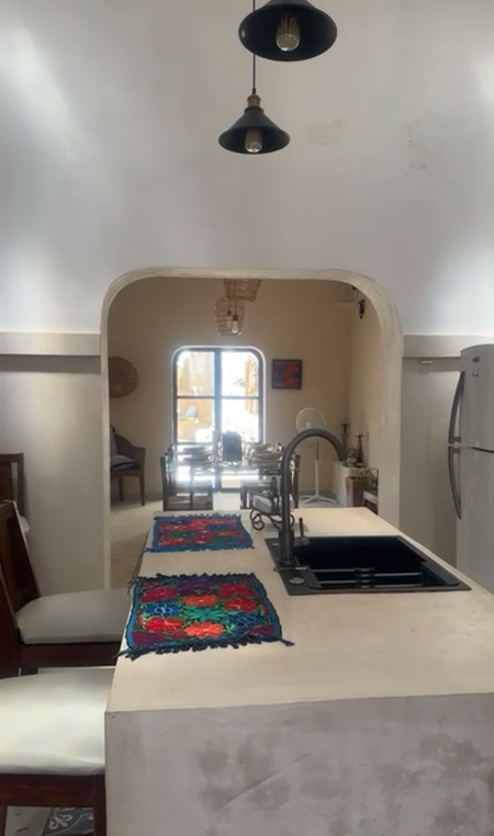 Cocina equipada con estufa de inducción eléctrica, tarja de acero inoxidable de buen tamaño, espacios de almacenamiento vestidos, isla desayunador con terminaciones en chukum y pasta!