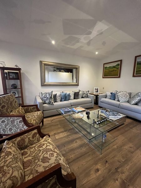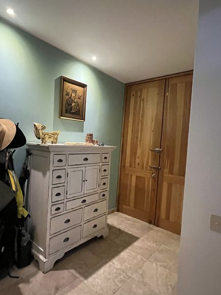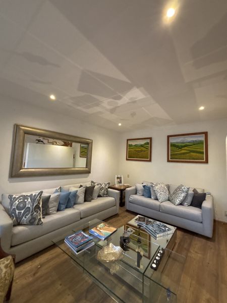 Bar con cava y tarja y una barra con luces indirectas, una bodega cuya puerta de madera la hace invisible. A la derecha está la sala de TV y un espacio que actualmente funciona como área de juegos de mesa la que tiene vista espectacular a la terraza y al bosque. el ventanal es de piso a techo, al abrir la ventana el espacio de la terraza forma parte de la sala de TV y el área de reuniones.