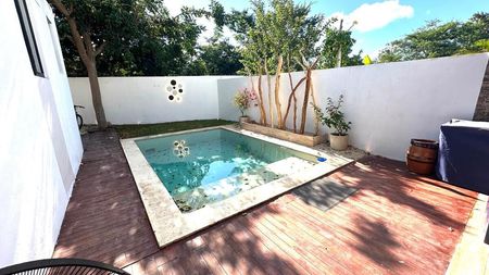 La parte trasera de la casa es un verdadero refugio privado: una terraza con área de bar, ideal para convivir y relajarse, te conduce hacia una hermosa alberca con baño exterior, creando el escenario perfecto para disfrutar los fines de semana en familia.