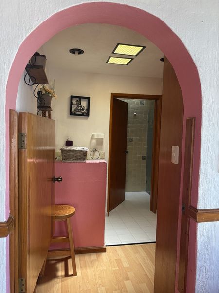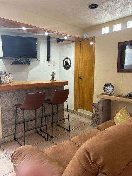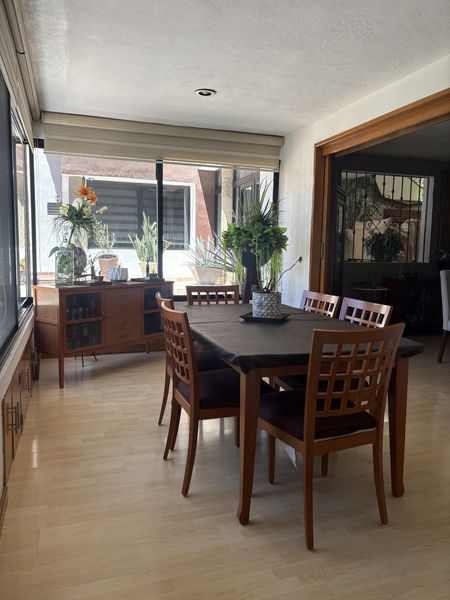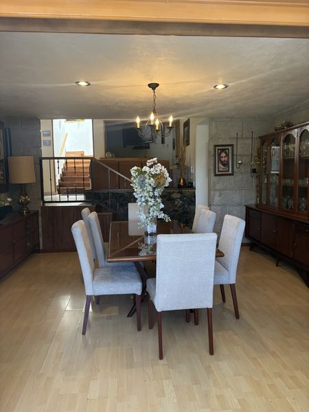 Antecomedor , comedor, medio baño de vistas , sala, cantina con barra de madera,recámara en planta baja con baño completo y vestidor.
