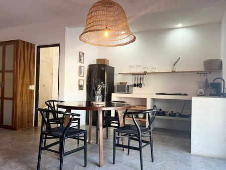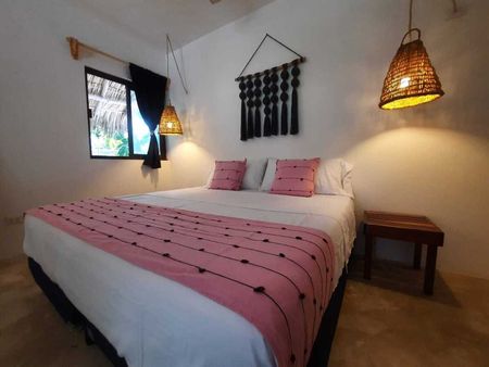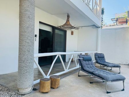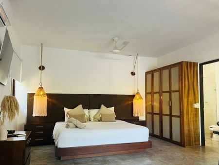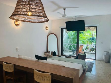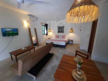 Cuenta con cama King SIZE, sofá cama, mesa de centro, comedor, cocina con estufa eléctrica, refrigerador, 2 ventiladores, de techo, aire acondicionado, baño completo, closet, terraza de 1.98x6.66 con 2 sillas y mesa.