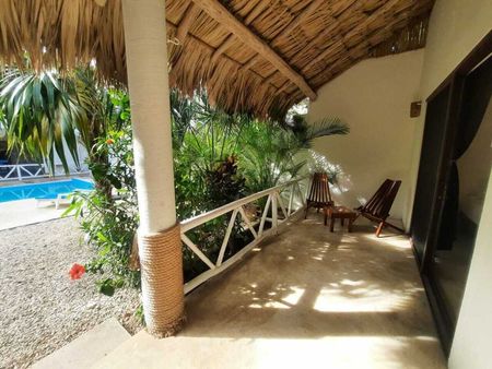 Cuenta con cama King SIZE, sillón, mesa de centro, frigobar, ventilador de techo, aire acondicionado, clóset, Bolaño completo, terraza de 1.98x4.18 con dos sillas y mesa.