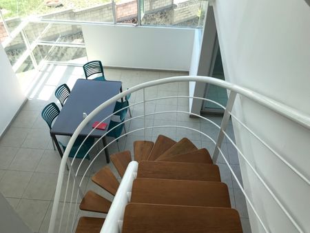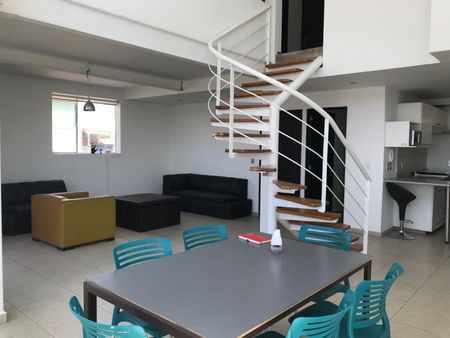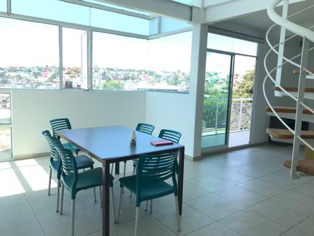 Amplio departamento de 2 pisos, AMUEBLADO en venta, ideal para estudiantes: PB: Sala y comedor con hermosa vista, agradable terraza con vista a las áreas verdes, cocina equipada e iluminada que cuenta con barra de trabajo y acceso al área de lavado, 1 recámara con baños. PA: 4 recámaras, 2 baños completos con lavamanos independientes de las regaderas y WC, 2 lugares de estacionamiento y 1 bodega.