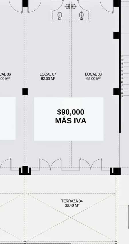 -Medidas interiores de 2 locales juntos: Local 7: 62 mt2 y local 8 : 65mt2