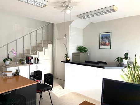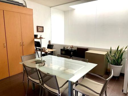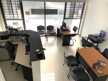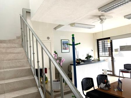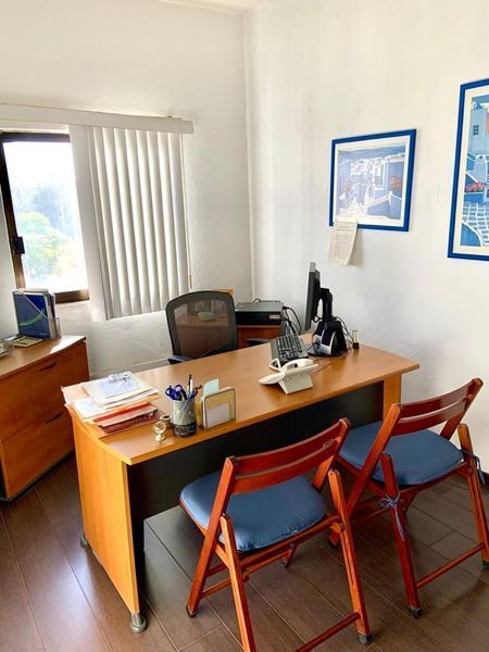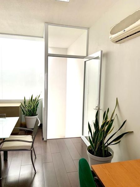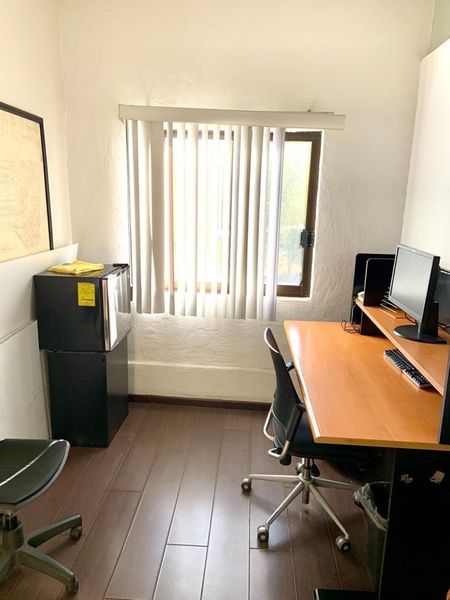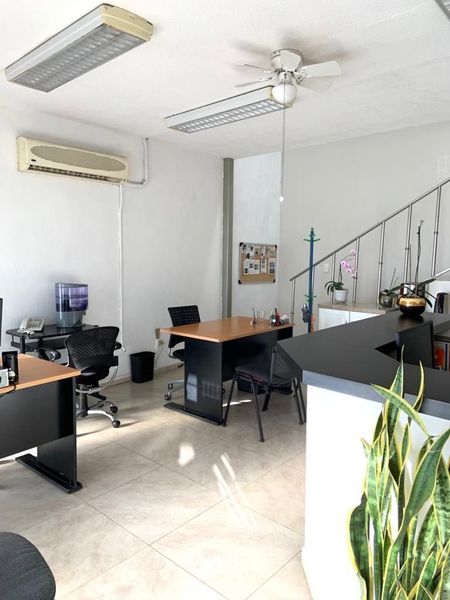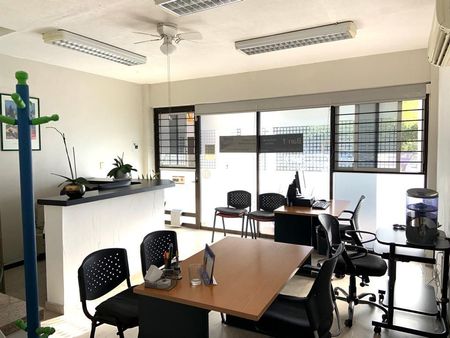 PB: recepción, área para 2 escritorios, medio baño y pequeña bodega. PA: 1 privado, 1 semi-privado, sala de juntas. Aire acondicionado, cortinas, mosquiteros. La cuota de mantenimiento $1,916.00, incluye consumo de agua.