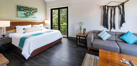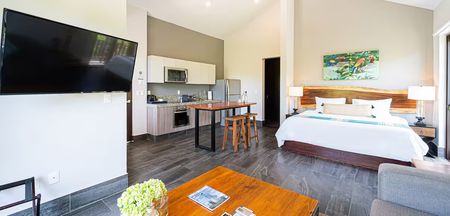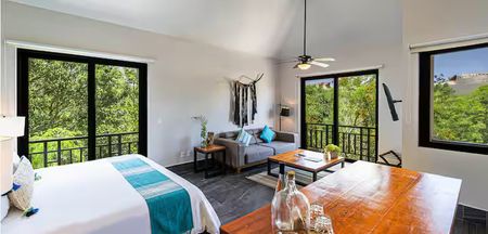 The 540 sqf2 condo has a full furnished studio on top floor for sale in Zama Oasis in Aldea Zama with 2 balconies overlooking the jungle, a living area, a full kitchen, a laundry area, and a full bathroom.