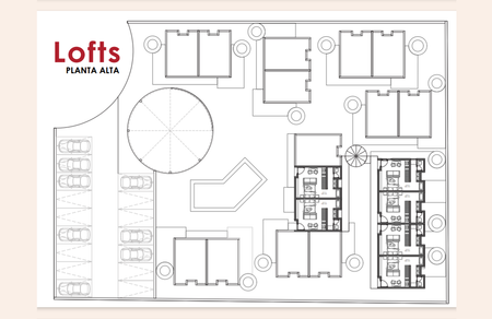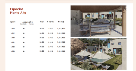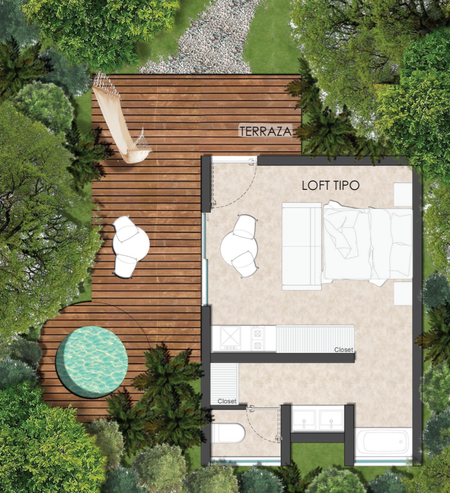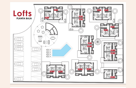Cuenta con 18 lofts de aproximadamente 30 m² interiores, además de terrazas, jardines y áreas comunes con diversas