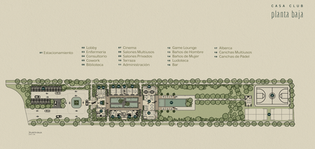 • Actividad física: gimnasio, canal de nado, alberca con terraza, canchas multiusos y de pádel, áreas deportivas.