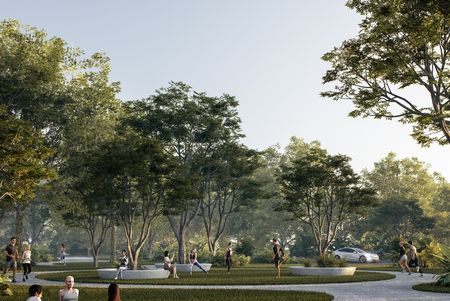 Avenida principal con camellón arbolado