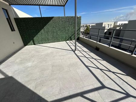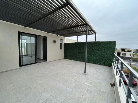 - Terraza techada con pergolado completo y policarbonato hacia el interior del condominio, separación con follaje artificial.