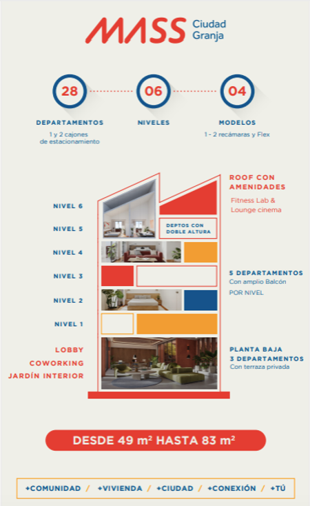 Este departamento contara con 28 unidades y 06 niveles, desde 49m2. hasta 84m2. Con un concepto perfecto para uso habitacional.