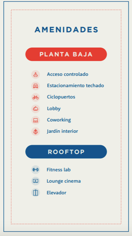El edificio contara con fantasticas amenidades tales como Ciclopuerto, Lobby, area de coworking, jardin interior, gimnasio y lounge cinema. A parte de esto tambien contara con seguridad las 24 horas, estacionamiento 24 horas y elevador.